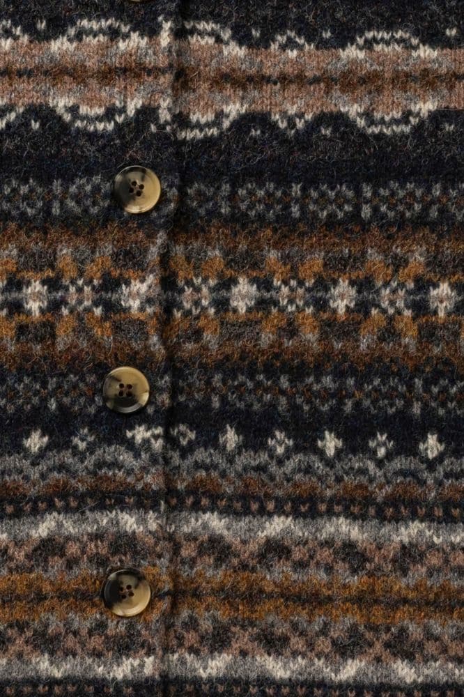 De Mallaig-kleurencombinatie is geïnspireerd op de natuur van Schotland: diepe tinten, warme kleuren en lichte accenten die samen een harmonieuze balans creëren. De veelzijdigheid maakt dat je deze cardigan zowel casual als gekleed kunt dragen, en dat hij moeiteloos matcht met jeans, corduroy of een wollen rok.