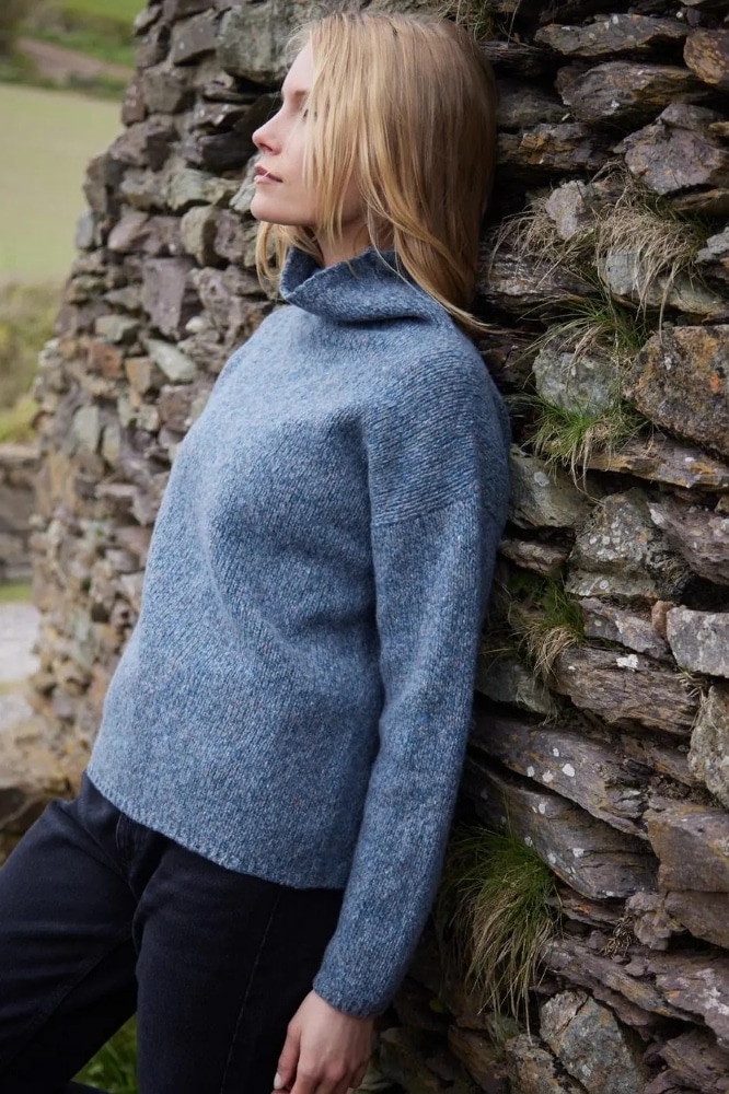 De kleur Blue Smoke is een elegante, tijdloze tint met subtiele Donegal-fleck, geïnspireerd op de Ierse kustlijn. Deze veelzijdige trui past moeiteloos bij jeans, een wollen rok of een klassieke pantalon. De licht opstaande hals geeft net dat beetje extra raffinement, terwijl de losse snit zorgt voor een ontspannen maar verzorgde uitstraling.