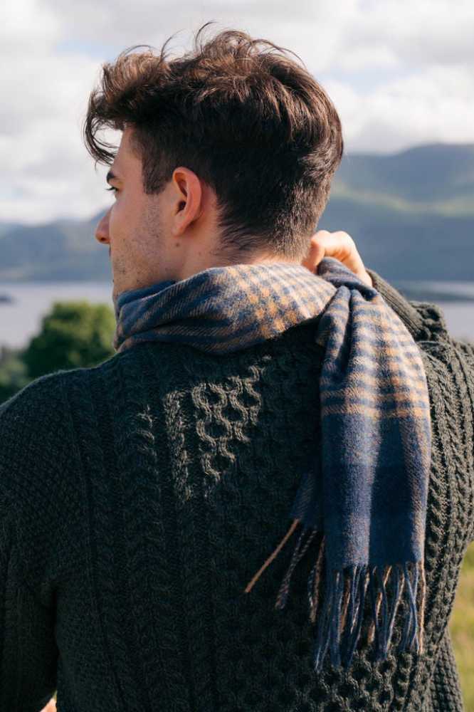 Details – John Hanly Irish Wool Scarf Long 1912 Denim Navy Beige Block Check