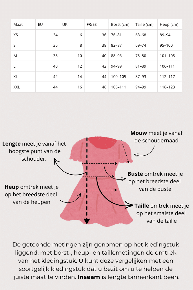 | Maat | EU | UK | FR/ES | Borst (cm) | Taille (cm) | Heup (cm) |