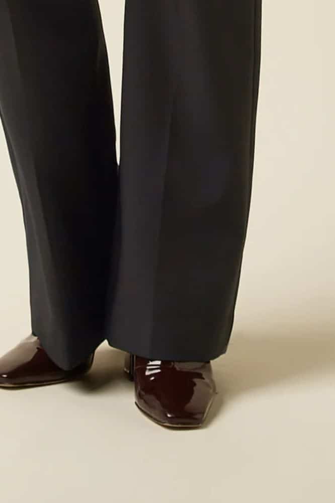 De stof heeft een subtiele stretch en is zacht aan de binnenzijde, wat zorgt voor bewegingsvrijheid en een prettig draaggevoel. De broek sluit met een rits en haaksluiting en heeft een klassieke tailleband met lusjes – perfect om af te stylen met een mooie riem. De diepe zwarte kleur maakt de broek tijdloos én makkelijk te combineren, bijvoorbeeld met een blouse met print of een aangesloten coltrui.