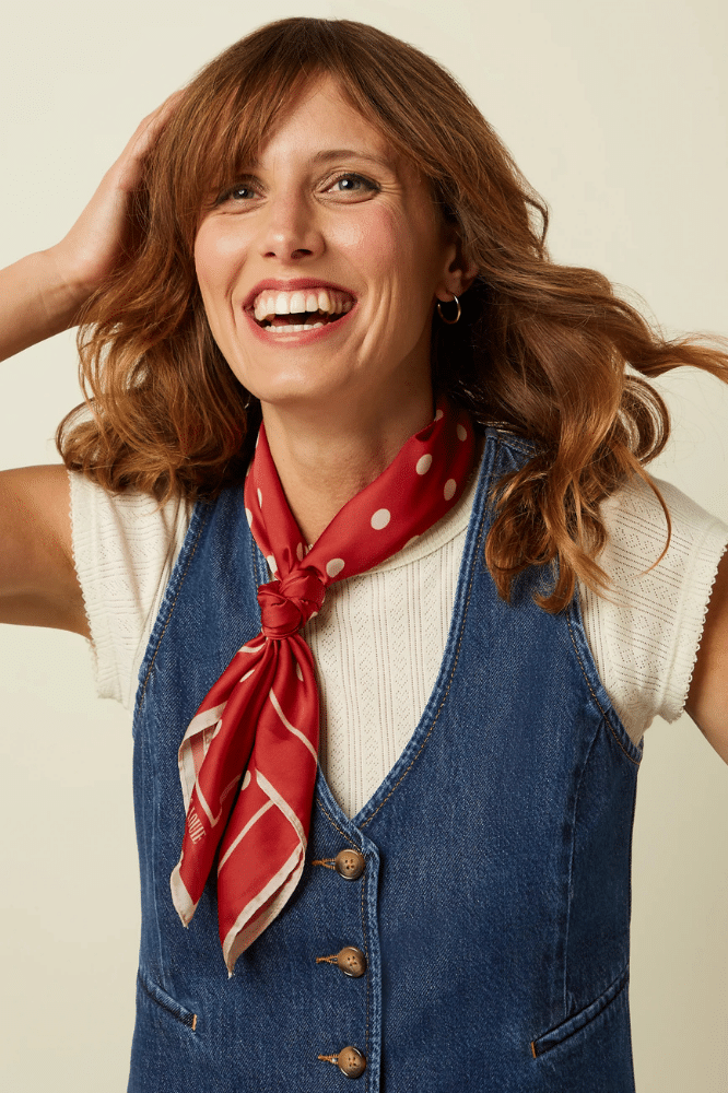 De Scarf Polka in Chili Red van King Louie is zo’n accessoire dat een outfit in één beweging afmaakt. De warme roodtint gecombineerd met de speelse stippenprint geeft karakter zonder te overheersen. Klein detail, groot effect.