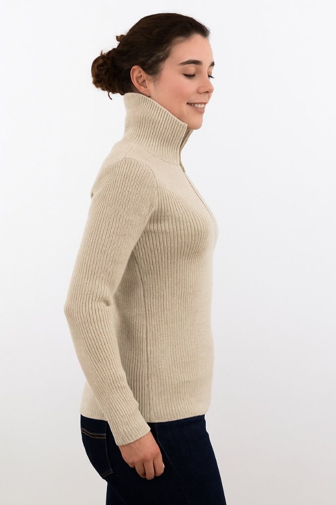 De Doutzen Schipperstrui Beehge van Roosenstein Wolke is dé damesvariant van de klassieke schipperstrui, speciaal ontworpen voor een vrouwelijke pasvorm zonder de stoere uitstraling te verliezen. Met zijn verfijnde parelvangsteek en subtiele heritage-details is dit een uniek stuk knitwear waarin traditie en modern design samenkomen. De trui heeft een half-zip rits aan de voorzijde, uitgevoerd in mat zwart met duurzame YKK-kwaliteit, en is afgewerkt met zwarte metalen accenten die direct refereren aan de iconische Rooscap-schipperspet.