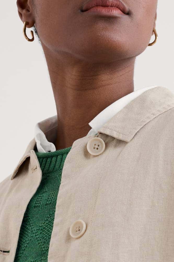 De Arame Jacket Whelk is gemaakt van 100% linnen, een duurzaam en ademend materiaal dat ideaal is voor warmere dagen. Linnen is van nature sterk en wordt met de tijd alleen maar zachter, waardoor het een uitstekende keuze is voor een bewuste garderobe.