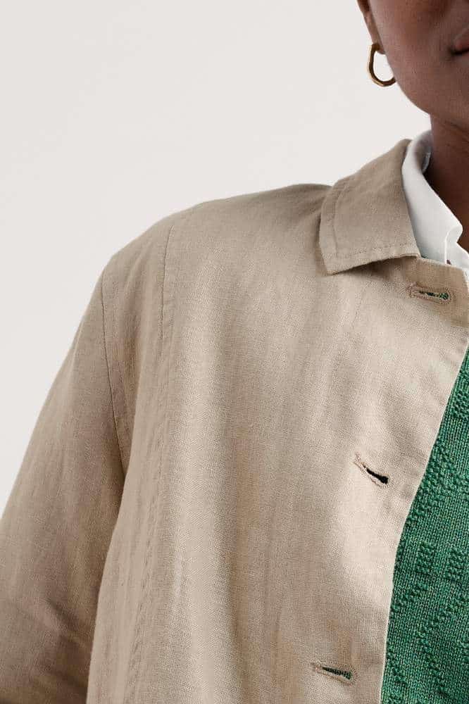 Wat dit jack zo bijzonder maakt, is de natuurlijke charme van het linnen. Het materiaal wordt met elke zomer zachter en soepeler, terwijl het unieke kleurnuances ontwikkelt die bijdragen aan de authentieke uitstraling van het kledingstuk. De ton-sur-ton knopen, praktische opgestikte zakken en subtiele details zoals de self-fabric hanging loop zorgen voor een stijlvol geheel dat jarenlang meegaat.