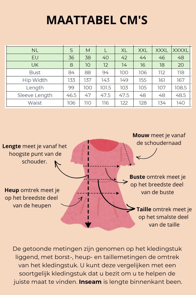 • Model draagt: maat UK 8 / EU 36 – lengte 1,76 m
