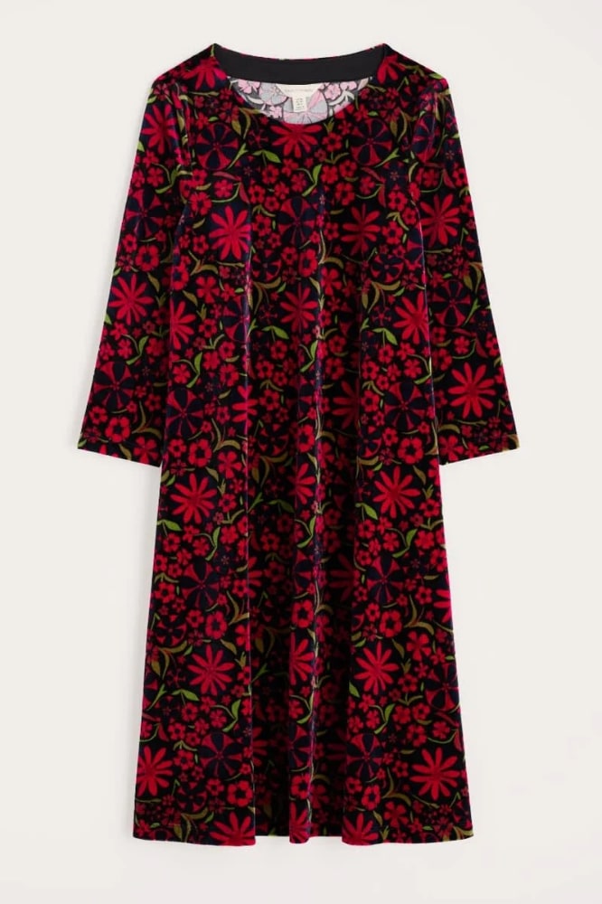 De Mahonia Dress Folky Flowers Onyx Carmine van Seasalt Cornwall is een elegante, fluwelen jurk die luxe en comfort combineert. Deze knie-lange jurk heeft een soepele valling en een subtiele glans die haar ideaal maakt voor winterse gelegenheden, feestdagen of een avondje uit. De shift fit met lichte stretch zorgt voor een flatterend silhouet dat soepel meebeweegt met het lichaam, terwijl de ronde boothals en lange mouwen een tijdloos, vrouwelijk karakter geven.