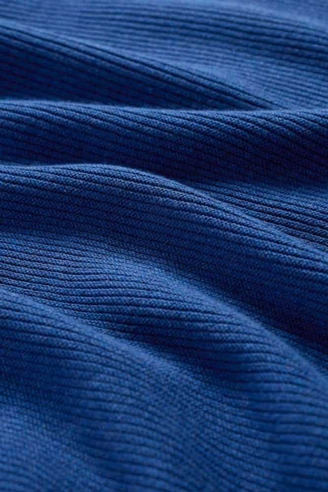 - Details: Textuurgebreid patroon, ribgebreide manchetten en zoom