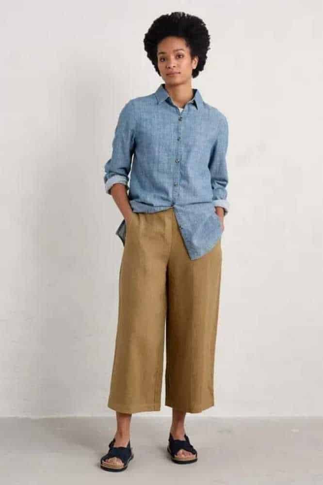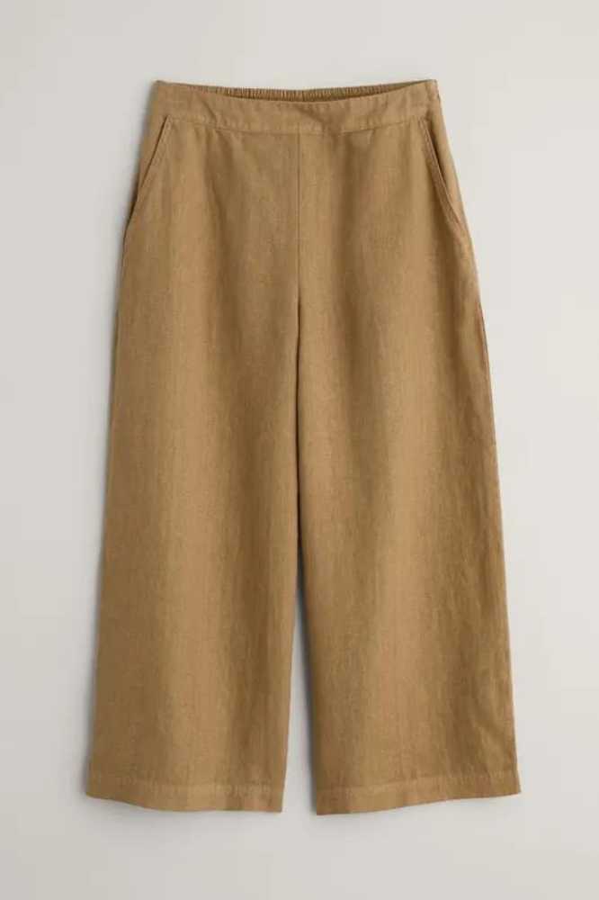 De Merrivale Culottes zijn ontworpen voor moeiteloze elegantie tijdens warme zomerdagen. Met een ontspannen wijde pijp en een comfortabele elastische taille aan de achterkant, bieden ze ultiem draagcomfort en een flatterende pasvorm. De verborgen zijrits zorgt voor een naadloze look aan de voorkant, terwijl de twee schuine zijzakken zorgen voor praktische bruikbaarheid, ideaal voor onderweg. De hoogwaardige, ademende linnenstof is gekleurd volgens de kledingverftechniek, wat niet alleen zachte kleuren oplevert, maar ook bijdraagt aan de duurzaamheid van het kledingstuk. Met hun veelzijdige ontwerp zijn deze culottes perfect voor allerlei gelegenheden, van ontspannen wandelingen op het strand tot stijlvolle uitstapjes naar de stad. Seasalt Cornwall comobineert de Merrivale hier met de Studio Glass Top.