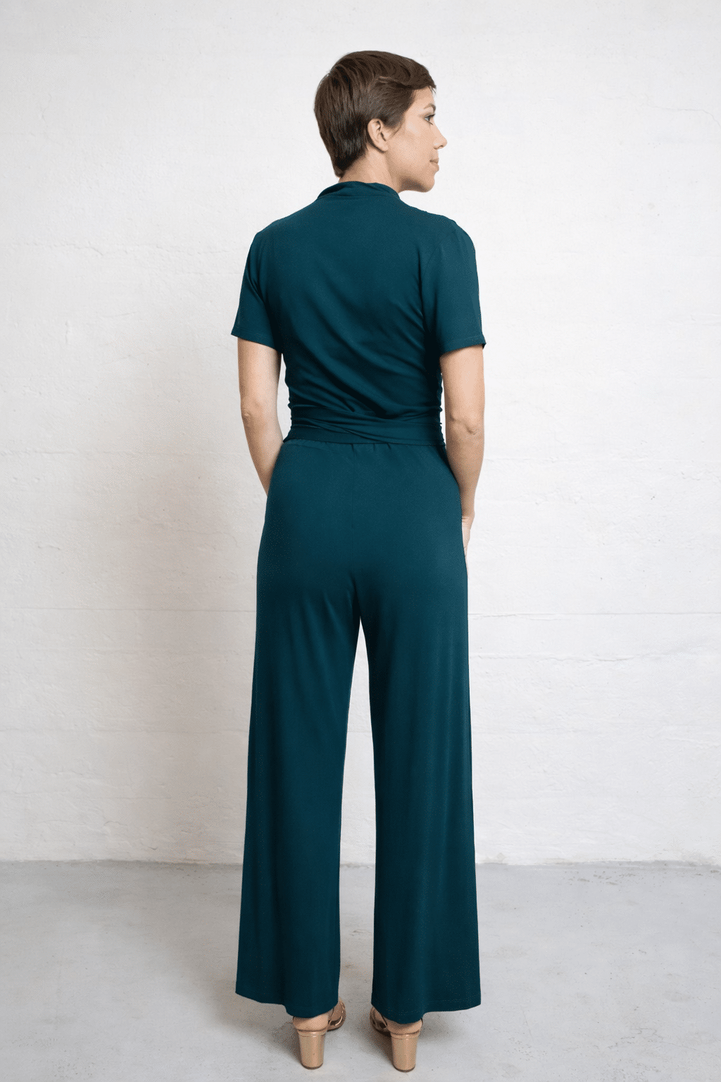De Emmylou Jumpsuit Petrol Tricot Deluxe is een elegante all-in-one met een vrouwelijke uitstraling en uitzonderlijk draagcomfort. Het aangesloten lijfje met overslag creëert een mooi silhouet, terwijl de bijpassende strikceintuur (voor of achter te strikken) de taille subtiel accentueert. De wijde broekspijpen zorgen voor een vloeiende lijn en een krachtige look.