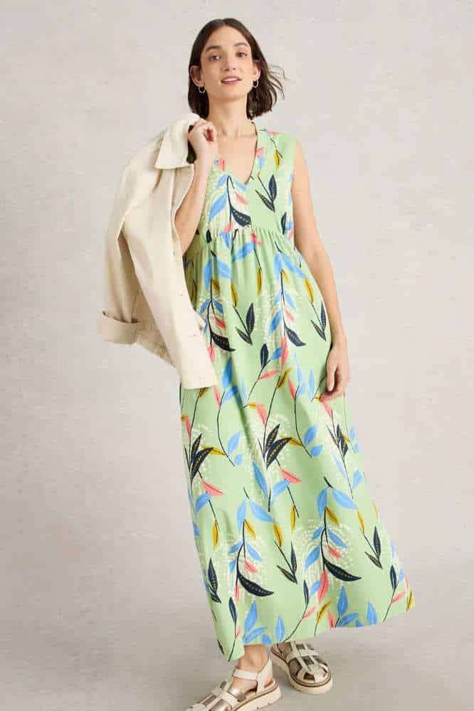 Stap in de zomer met een frisse, vrouwelijke flair dankzij de Archer Jersey Maxi Dress Green Multi van White Stuff. Deze prachtige maxi-jurk is een ode aan de natuur, uitgevoerd in een botanische print die zomers groen ademt. De jurk is ontworpen met oog voor elegantie én comfort, en flatteert het lichaam op een moeiteloze manier. Het mouwloze model en de flatterende V-hals maken het een luchtige keuze voor warme dagen, terwijl de iets verhoogde taille en het aangesloten lijfje zorgen voor een verfijnde pasvorm. De rok loopt sierlijk uit en beweegt mooi met je mee – perfect voor een ontspannen dagje stad of een zomerfeestje.