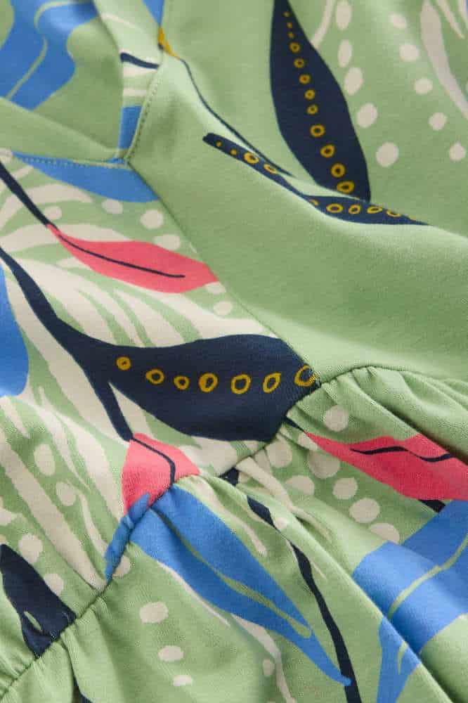 Dankzij de rijke kleur en botanische print straalt deze jurk een zomerse charme uit waar je keer op keer naar zult grijpen. Een ideale keuze voor vrouwen die bewust én stijlvol willen kleden.